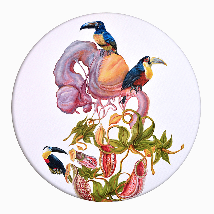 Los Tucanes. Óleo sobre papel, diámetro 45 CM .